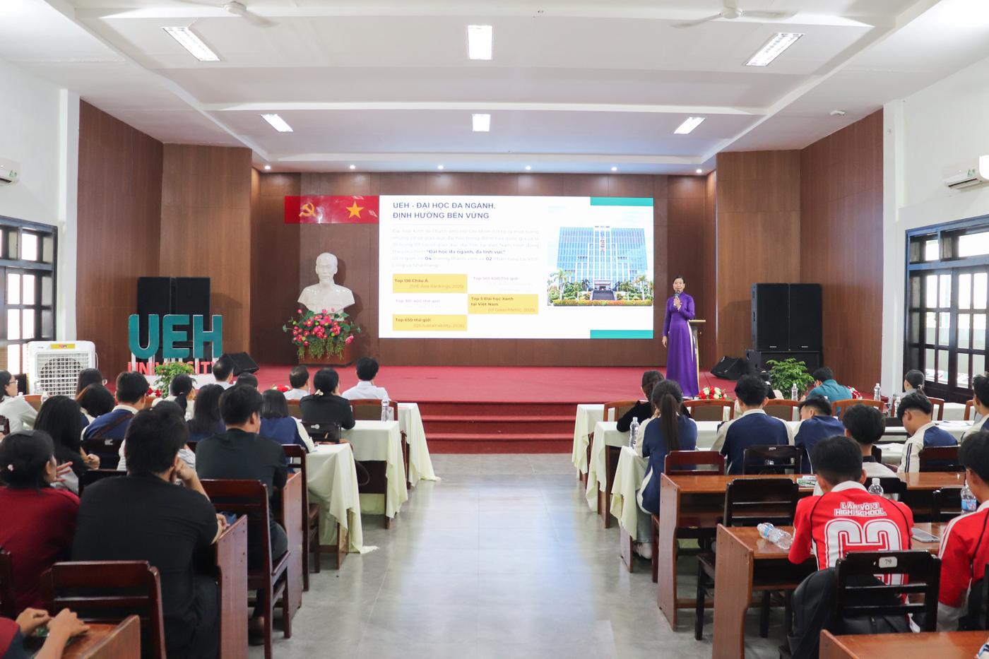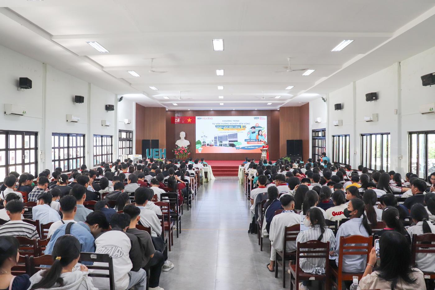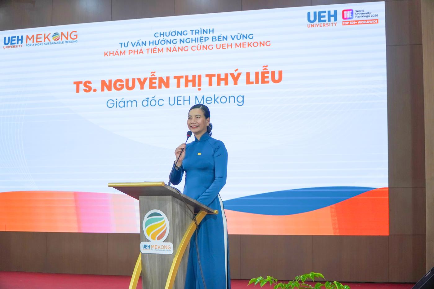 Mở đầu chương trình tư vấn hướng nghiệp, TS. Nguyễn Thị Thý Liễu phát biểu chào mừng và giới thiệu về thông tin tuyển sinh của UEH và UEH Mekong. Năm 2026, UEH Mekong (học tại Vĩnh Long, mã trường KSV) tuyển sinh 15 chương trình đào tạo. Trong đó, 09 chương trình tuyển sinh toàn quốc, gồm: Thuế, Logistics và Quản lý chuỗi cung ứng, Thương mại điện tử, Luật kinh tế, Kinh doanh nông nghiệp, Quản trị khách sạn, Tiếng Anh thương mại, Công nghệ và Đổi mới sáng tạo, Robot và Trí tuệ nhân tạo (hệ kỹ sư). 06 chương trình đào tạo tuyển sinh khu vực ĐBSCL, gồm: Quản trị kinh doanh, Kinh doanh quốc tế, Marketing, Tài chính, Ngân hàng và Kế toán doanh nghiệp. Hơn nữa, chương trình đào tạo cử nhân quốc tế được cấp bằng bởi: WSU (Úc); VUW (New Zealand); UVic (Canada); MUST (Đài Loan).