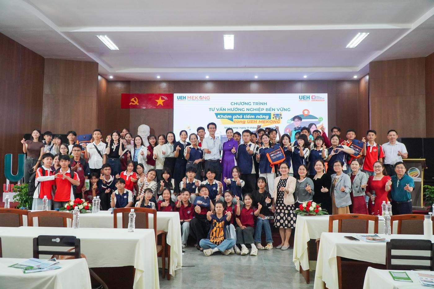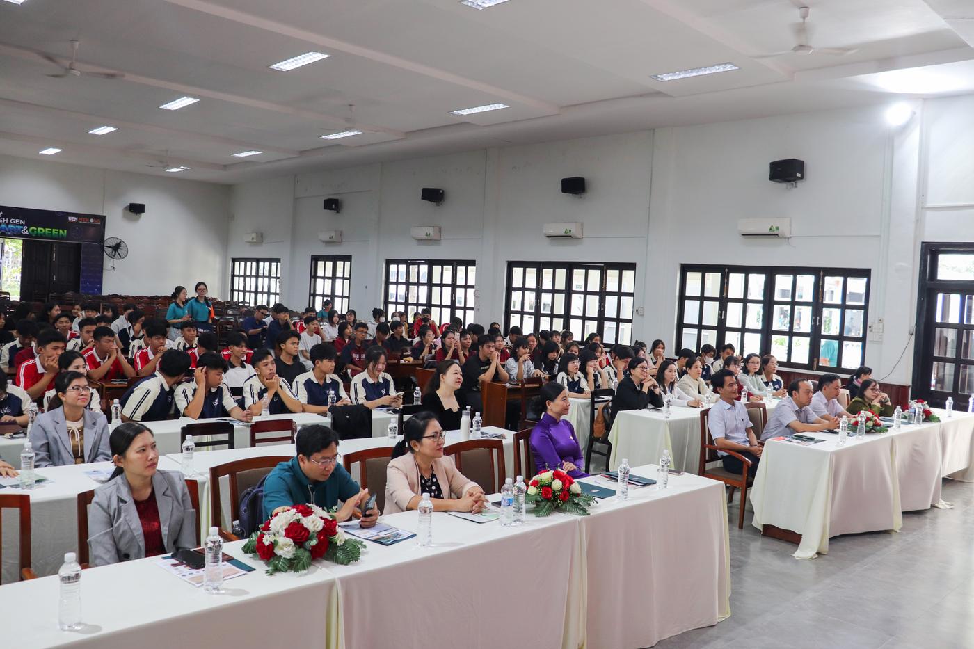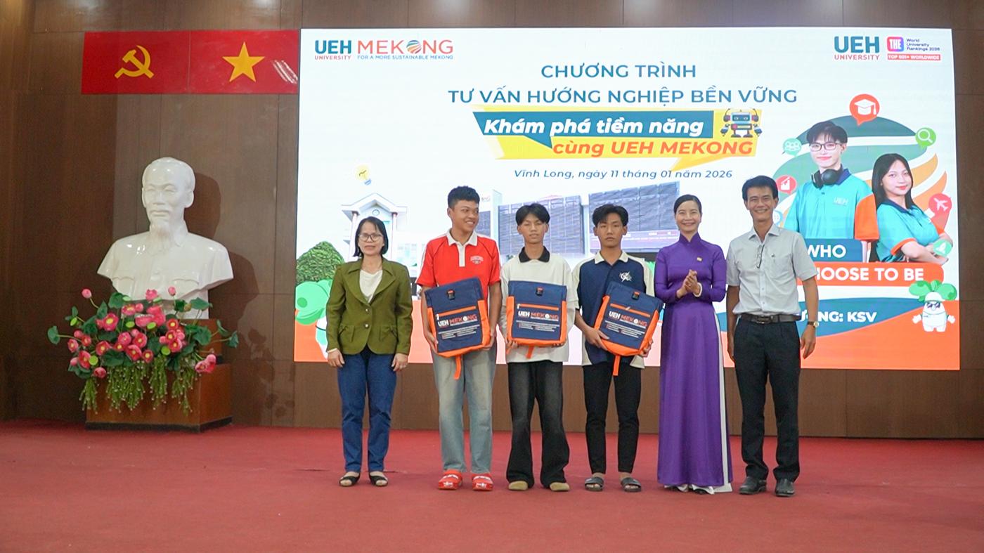 Mở đầu chương trình tư vấn hướng nghiệp, TS. Nguyễn Thị Thý Liễu phát biểu chào mừng và giới thiệu về thông tin tuyển sinh của UEH và UEH Mekong. Năm 2026, UEH Mekong (học tại Vĩnh Long, mã trường KSV) tuyển sinh 15 chương trình đào tạo. Trong đó, 09 chương trình tuyển sinh toàn quốc, gồm: Thuế, Logistics và Quản lý chuỗi cung ứng, Thương mại điện tử, Luật kinh tế, Kinh doanh nông nghiệp, Quản trị khách sạn, Tiếng Anh thương mại, Công nghệ và Đổi mới sáng tạo, Robot và Trí tuệ nhân tạo (hệ kỹ sư). 06 chương trình đào tạo tuyển sinh khu vực ĐBSCL, gồm: Quản trị kinh doanh, Kinh doanh quốc tế, Marketing, Tài chính, Ngân hàng và Kế toán doanh nghiệp. Hơn nữa, chương trình đào tạo cử nhân quốc tế được cấp bằng bởi: WSU (Úc); VUW (New Zealand); UVic (Canada); MUST (Đài Loan).