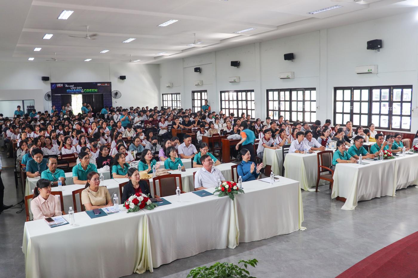 Chương trình tư vấn hướng nghiệp bền vững với chủ đề “Khám phá tiềm năng cùng UEH Mekong” đã thu hút và nhận được sự quan tâm của Ban Giám hiệu, Thầy cô giáo và các em học sinh với nhiều câu hỏi được đặt ra xoay quanh những điểm mới trong đề án tuyển sinh UEH năm 2026 về thời gian đào tạo, phương thức xét tuyển, học phí, thông tin học bổng, cơ hội việc làm của các chương trình đào tạo,…