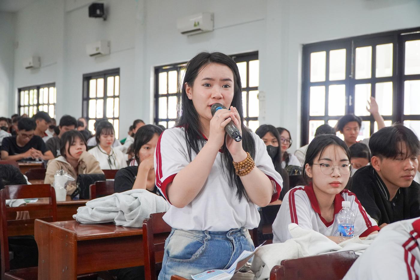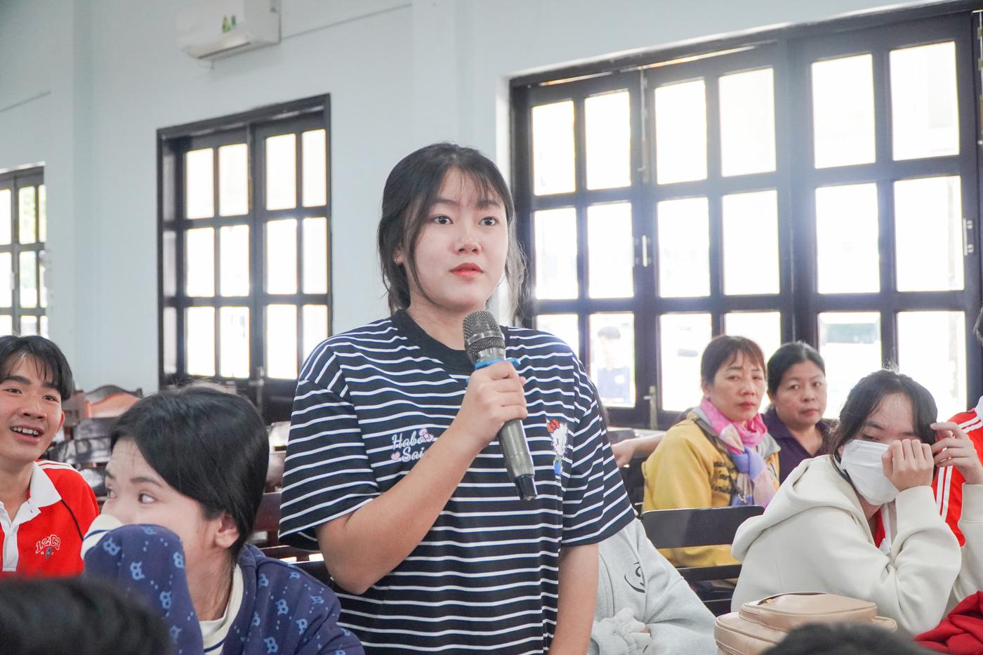 Học sinh tham gia đặt câu hỏi tìm hiểu về một số chương trình đào tạo, điểm chuẩn, môi trường học tập, điều kiện, bằng cấp, học phí và cơ hội việc làm