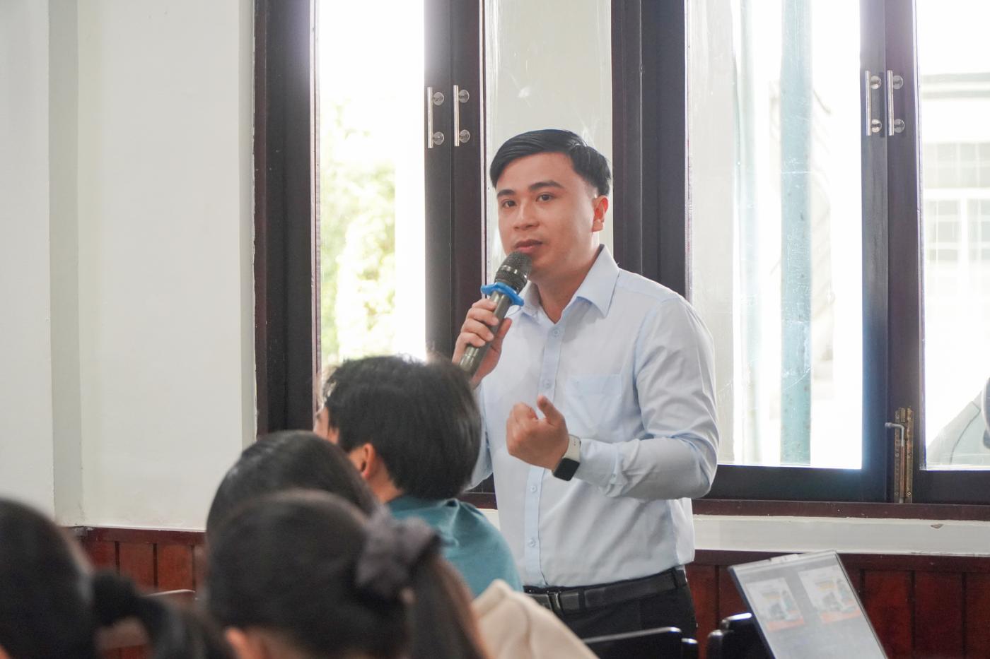 ThS. Nguyễn Trung Tiến – Giảng viên khoa Quản trị, Bí thư Đoàn phân hiệu giải đáp thắc mắc của học sinh về chương trình đào tạo Logistics và Quản lý chuỗi cung ứng, tham gia hoạt động phong trào rèn luyện kỹ năng